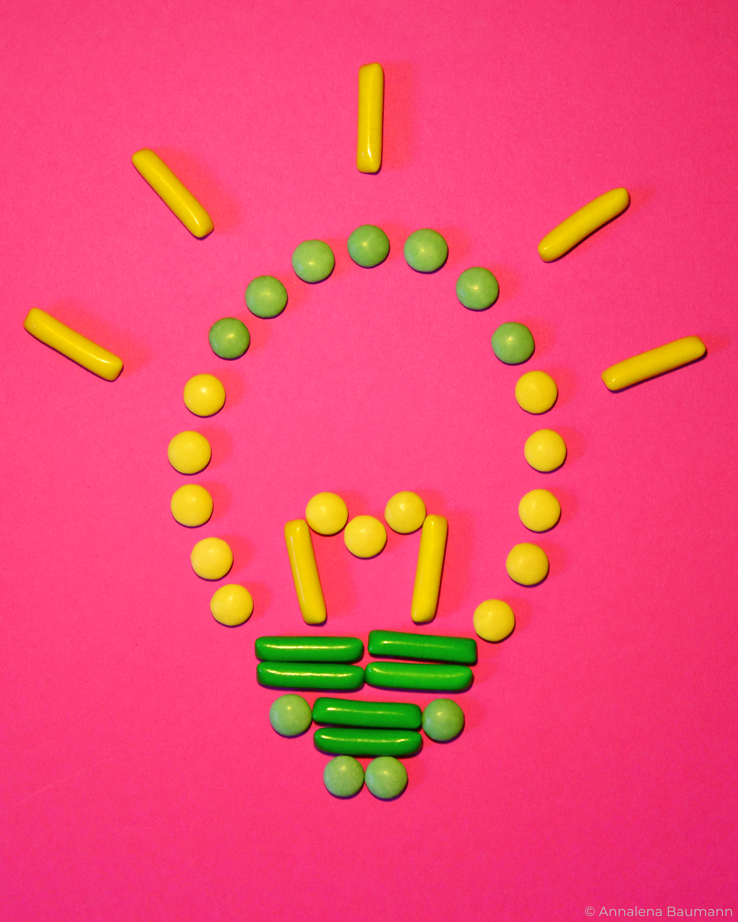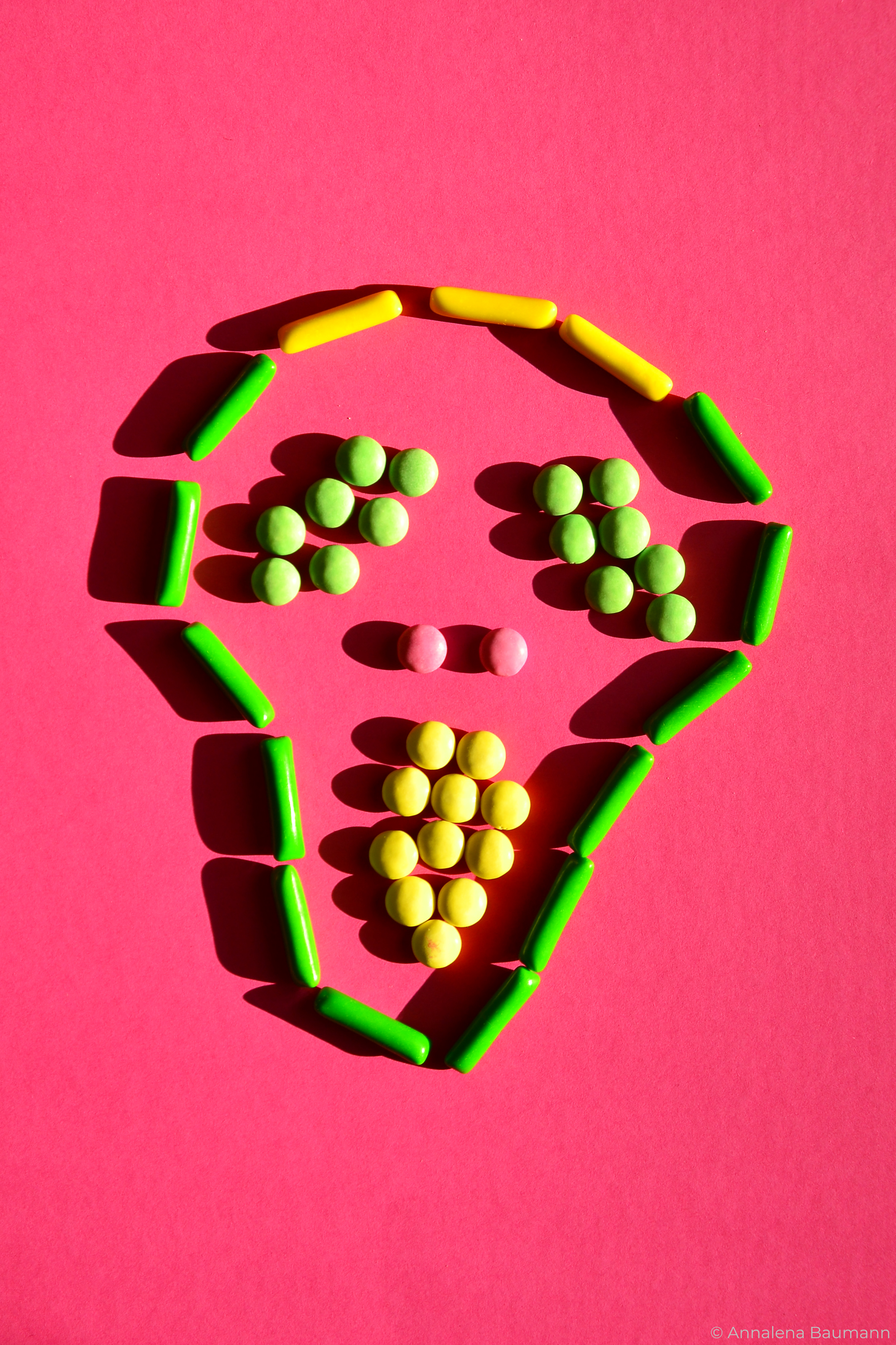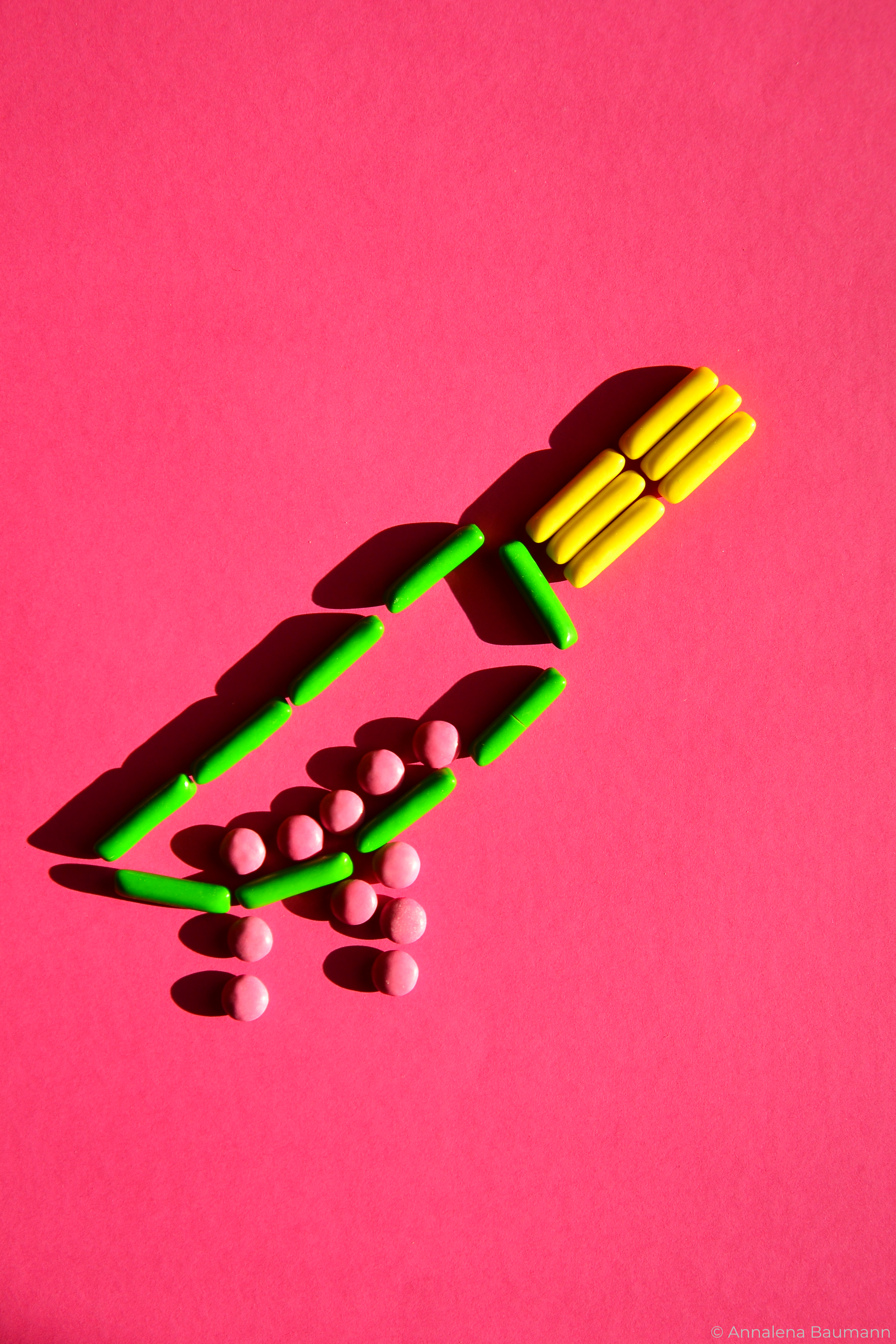 Die gezeigten Fotos wurden ebefalls in den drei Farben des zugehörigen Print-Projekts gestaltet. In diesem Fall wurde mit Süßigkeiten gearbeitet, um die Fotografie mit dem ausgewählten Text zu verknüpfen. Zudem wurde versucht, neue, dynamische Bilder mit ihnen zu schaffen.