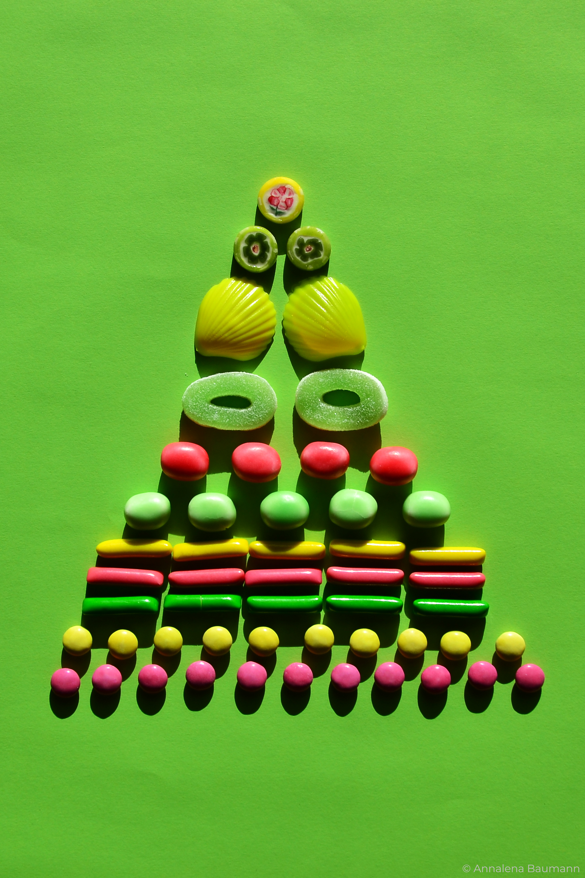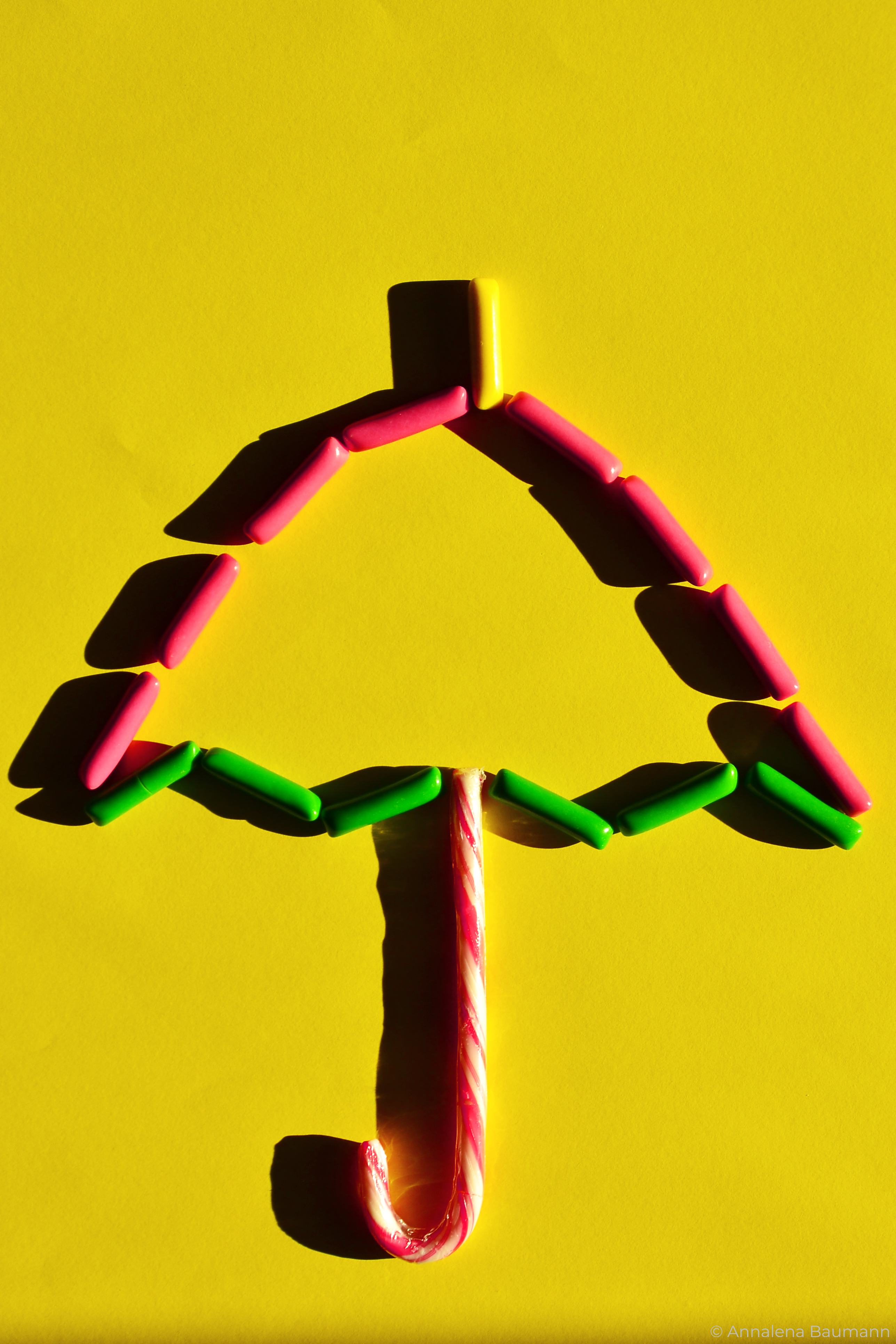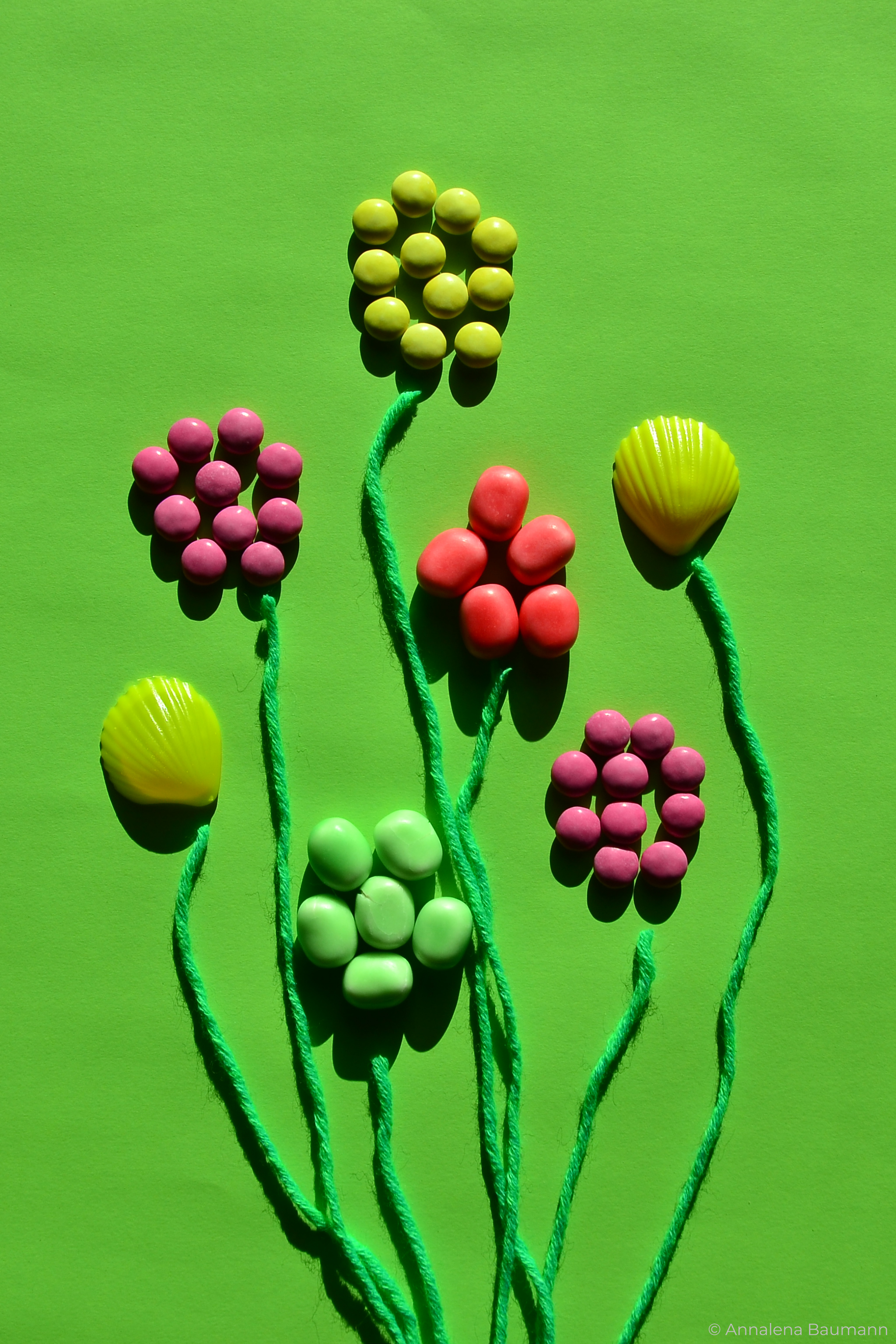 Die gezeigten Fotos wurden ebefalls in den drei Farben des zugehörigen Print-Projekts gestaltet. In diesem Fall wurde mit Süßigkeiten gearbeitet, um die Fotografie mit dem ausgewählten Text zu verknüpfen. Zudem wurde versucht, neue, dynamische Bilder mit ihnen zu schaffen.