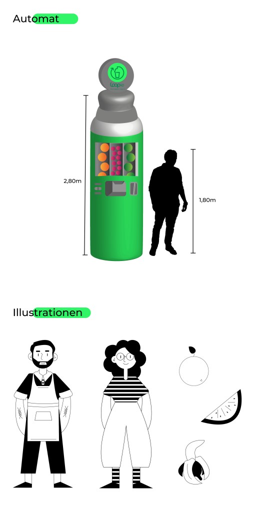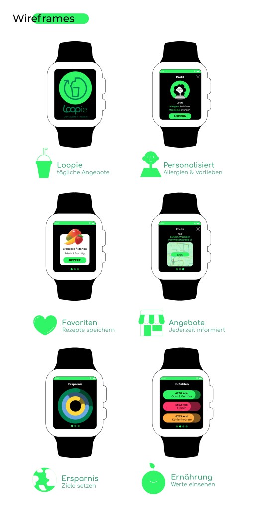 Hierzu stellt der Supermarkt einen Automaten auf, der dann mit den entsprechenden Lebensmitteln befüllt werden kann. Der Automat sendet sein aktuelles Angebot an den Smartwatch-Dienst und informiert so den User. Zudem ist es dem User möglich Rezepte zu speichern, Allergien und Vorlieben anzugeben und zu sehen, wie er mit dem Genuss eines Loopies der Umwelt etwas Gutes tut. Loopie ergänzt den aktuellen Loopie des Tages zudem mit individuell auf den User zugeschnittenen Zutaten, beispielsweise aufgrund des Bewegungslevels.