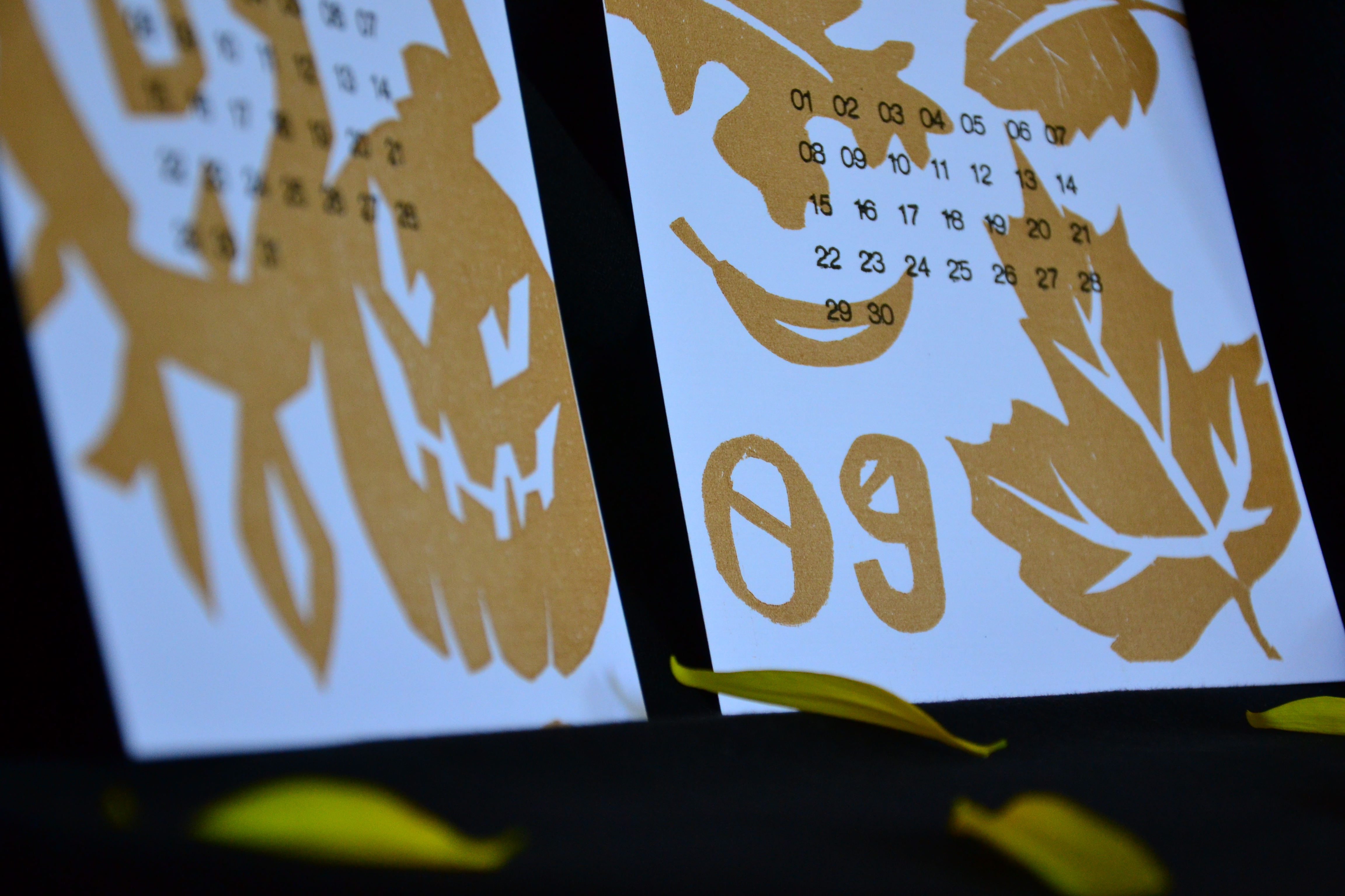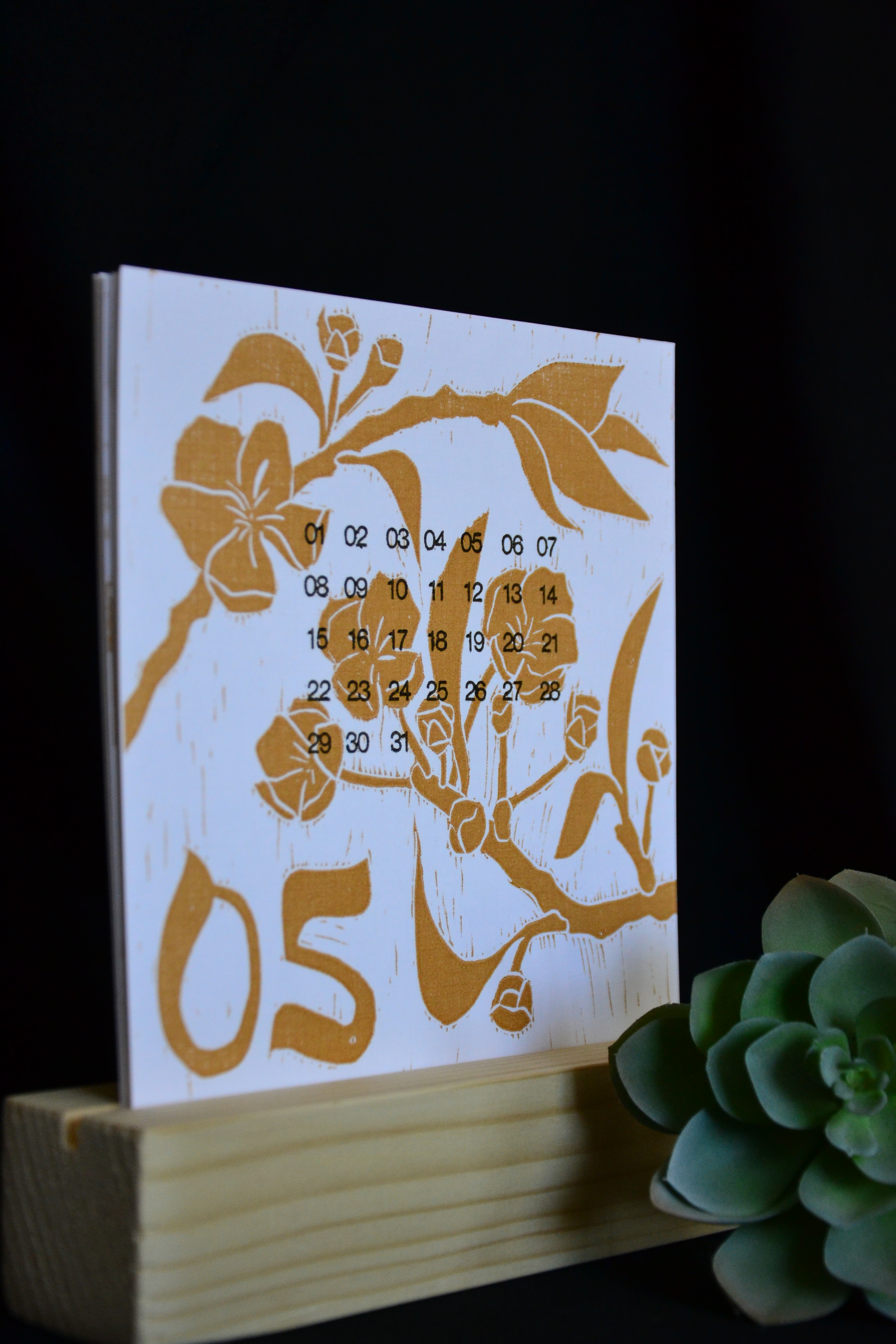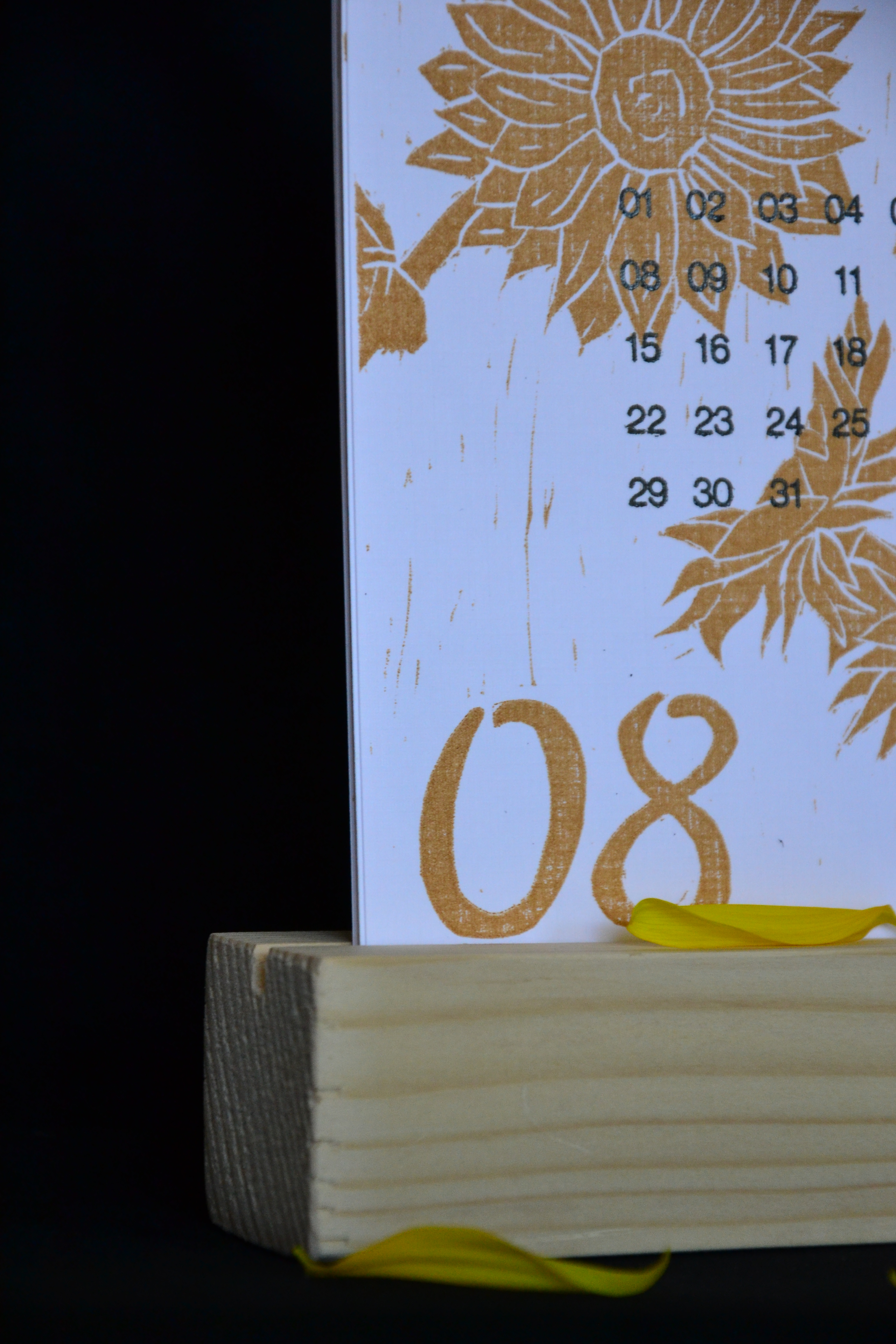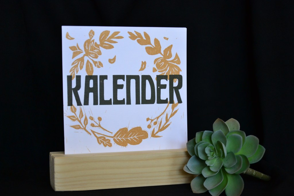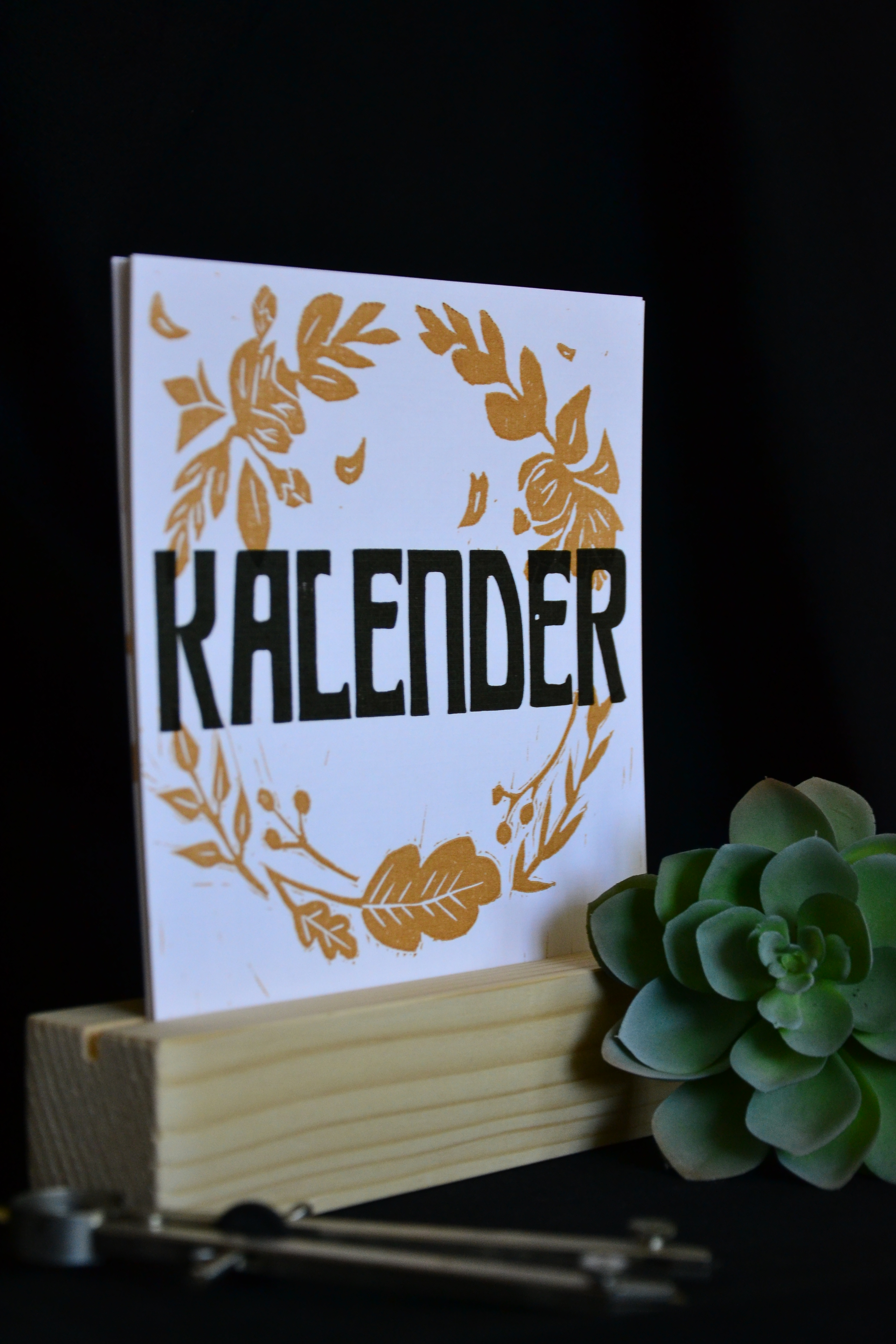 Dieser Kalender wurde im Rahmen eines Bleisatz-Kurses an der Hochschule Pforzheim erstellt. Ziel war es, eine passende Pflanze zum jeweiligen Monat zu wählen und diese in einem Linolschnitt umzusetzen. Das Kalendarium wurde mit einem Handsatz gesetzt und anschließend über das Pflanzenmotiv gedruckt. Die fertigen Motive finden ihren Platz in einem kleinen Ständer aus Holz.
