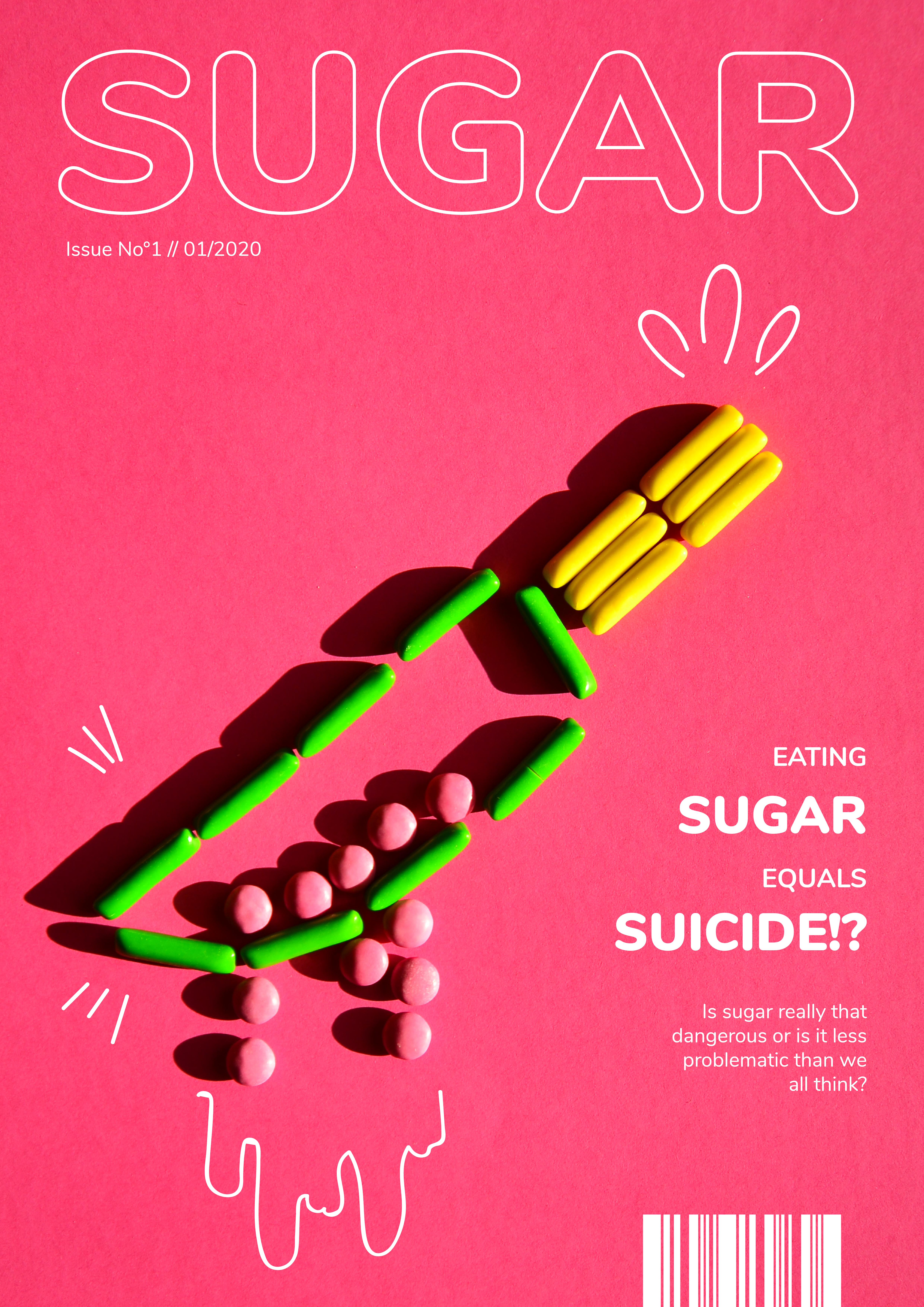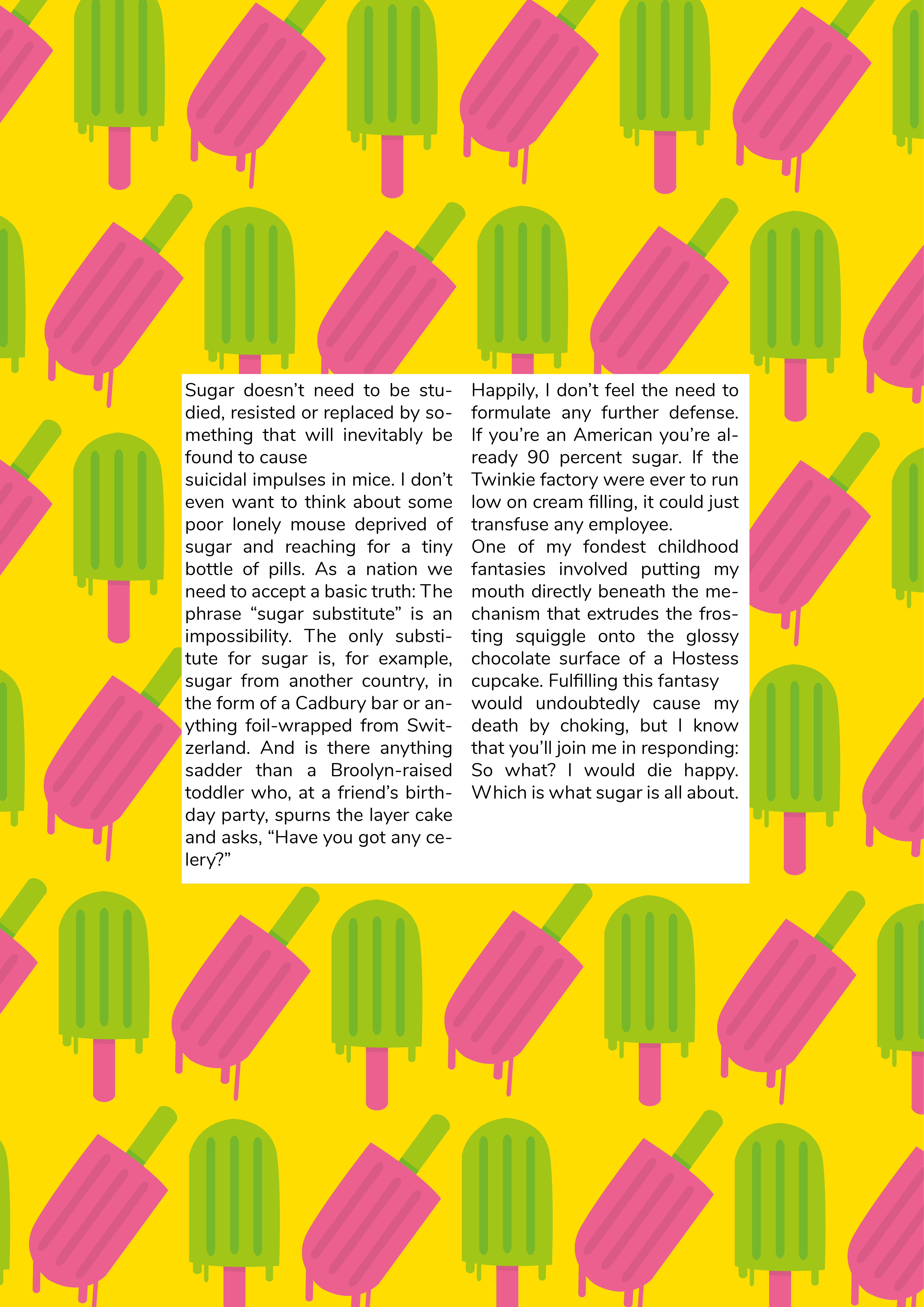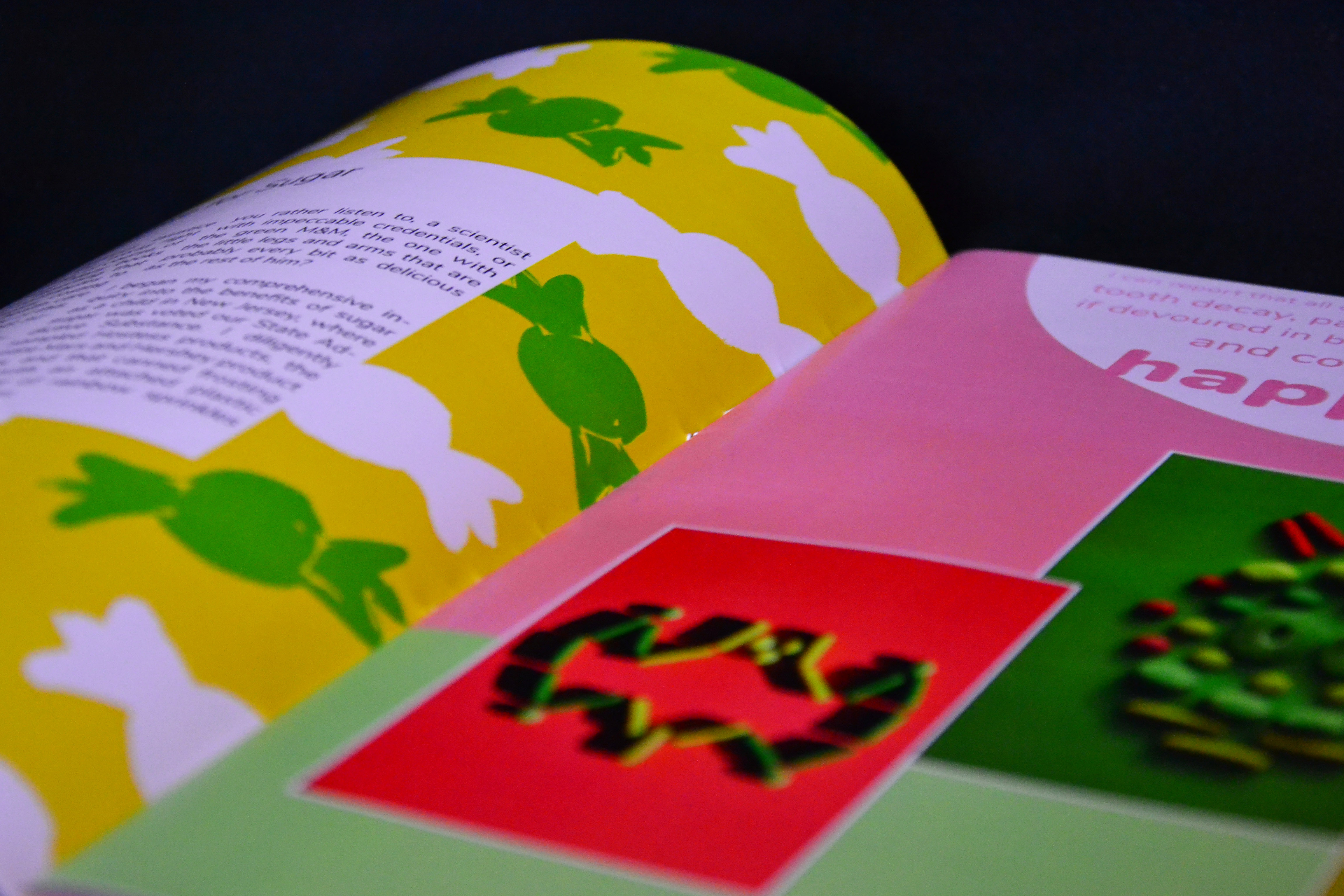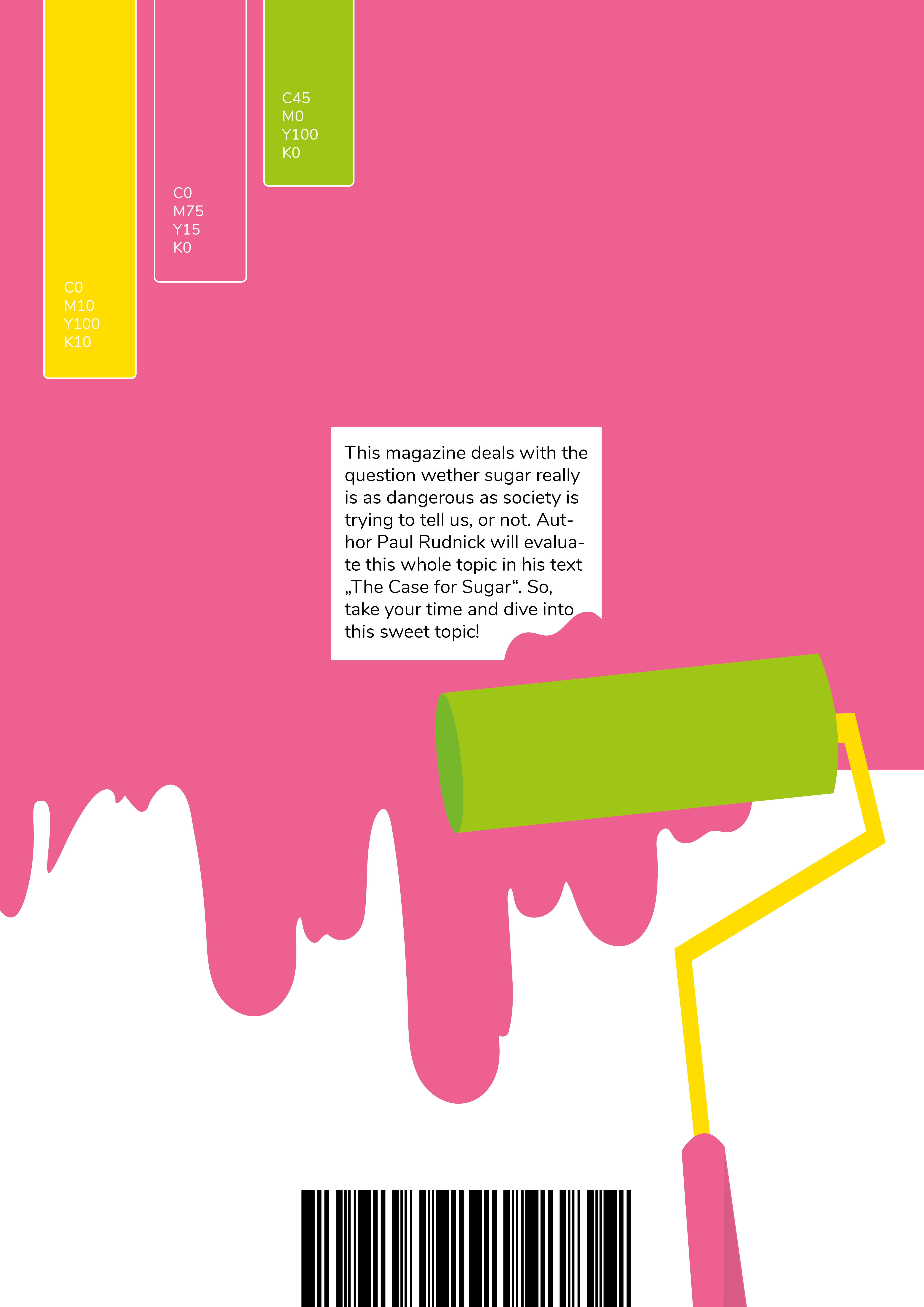 Die gewählten Farben waren hellgrün, pink und gelb. Zudem hatte wurde ein Text zum Thema Zuckerkonsum des Autors Paul Rudnick ausgesucht. Das Layout setzte sich aus drei Teilen zusammen: Zuerst wurde eine Art Mini-Lookbook gestaltet, dass des Prozess dokumentiert. Im zweiten Teil wurde die Fotoserie umfassend beleuchtet, und im dritten Teil habe wurde sich intensiv mit verschiedenen Layout-Möglichkeiten befasst. In diesem Zuge sind ein kleines Magazin, zwei Poster und eine Rubbellos-Seite entstanden.