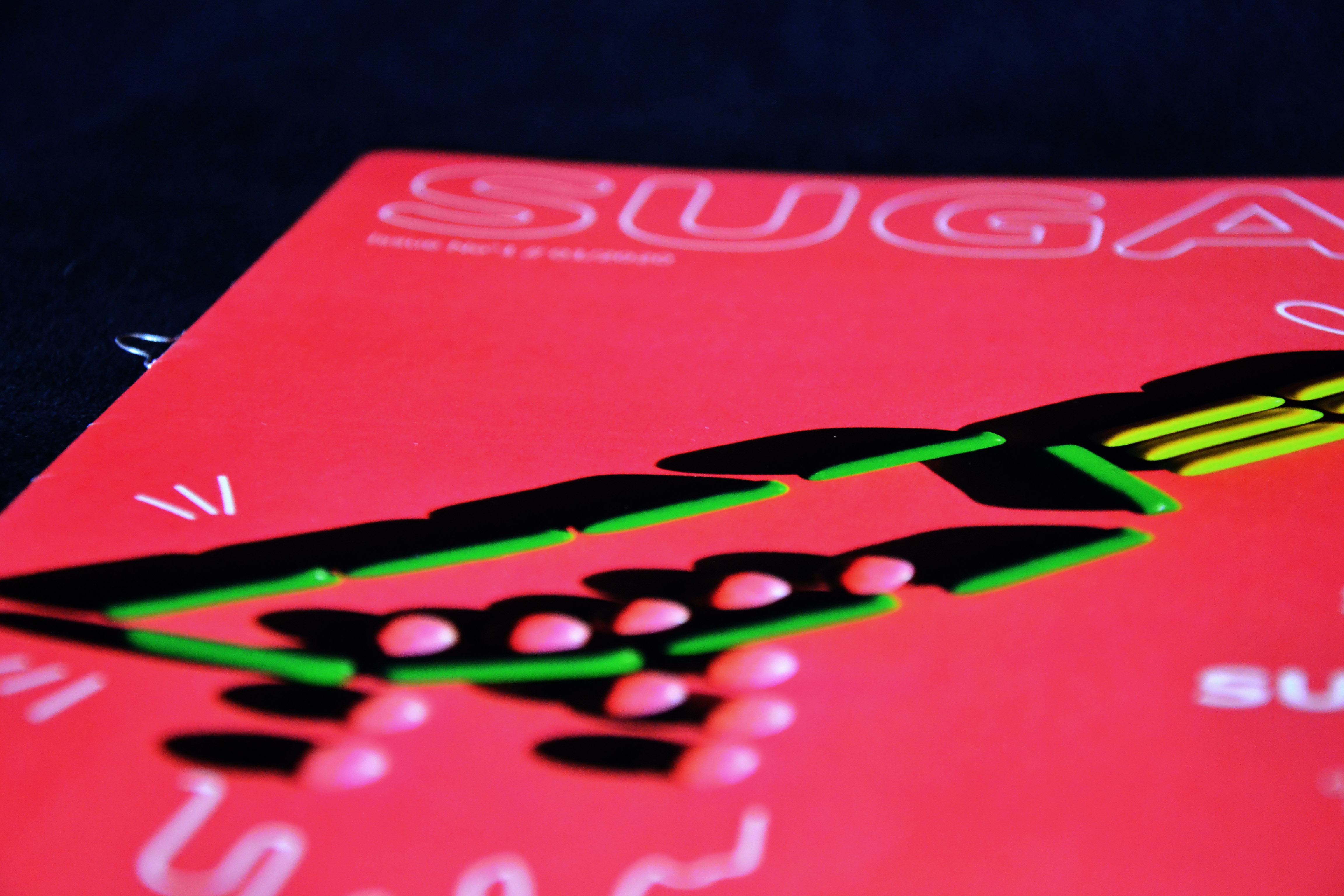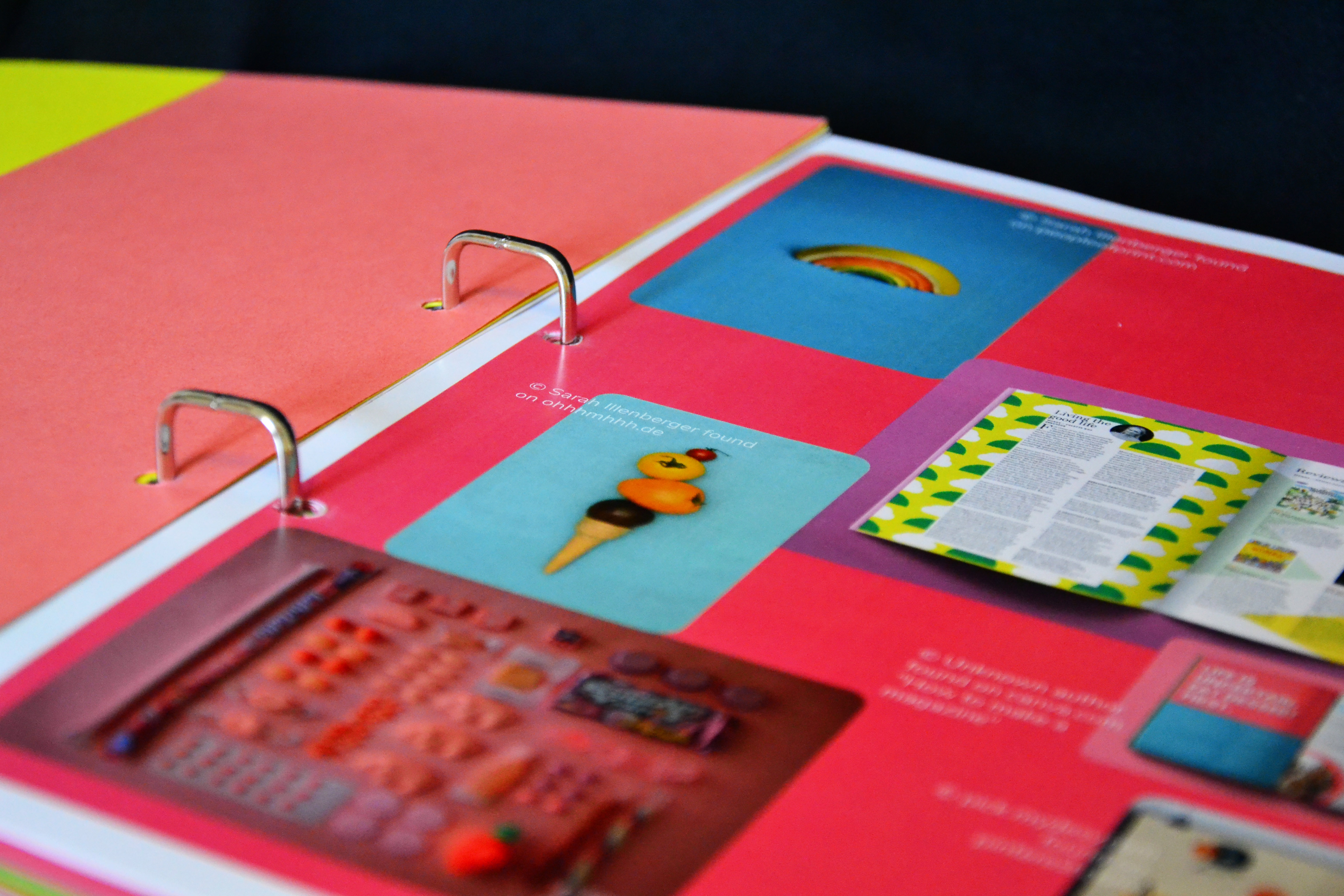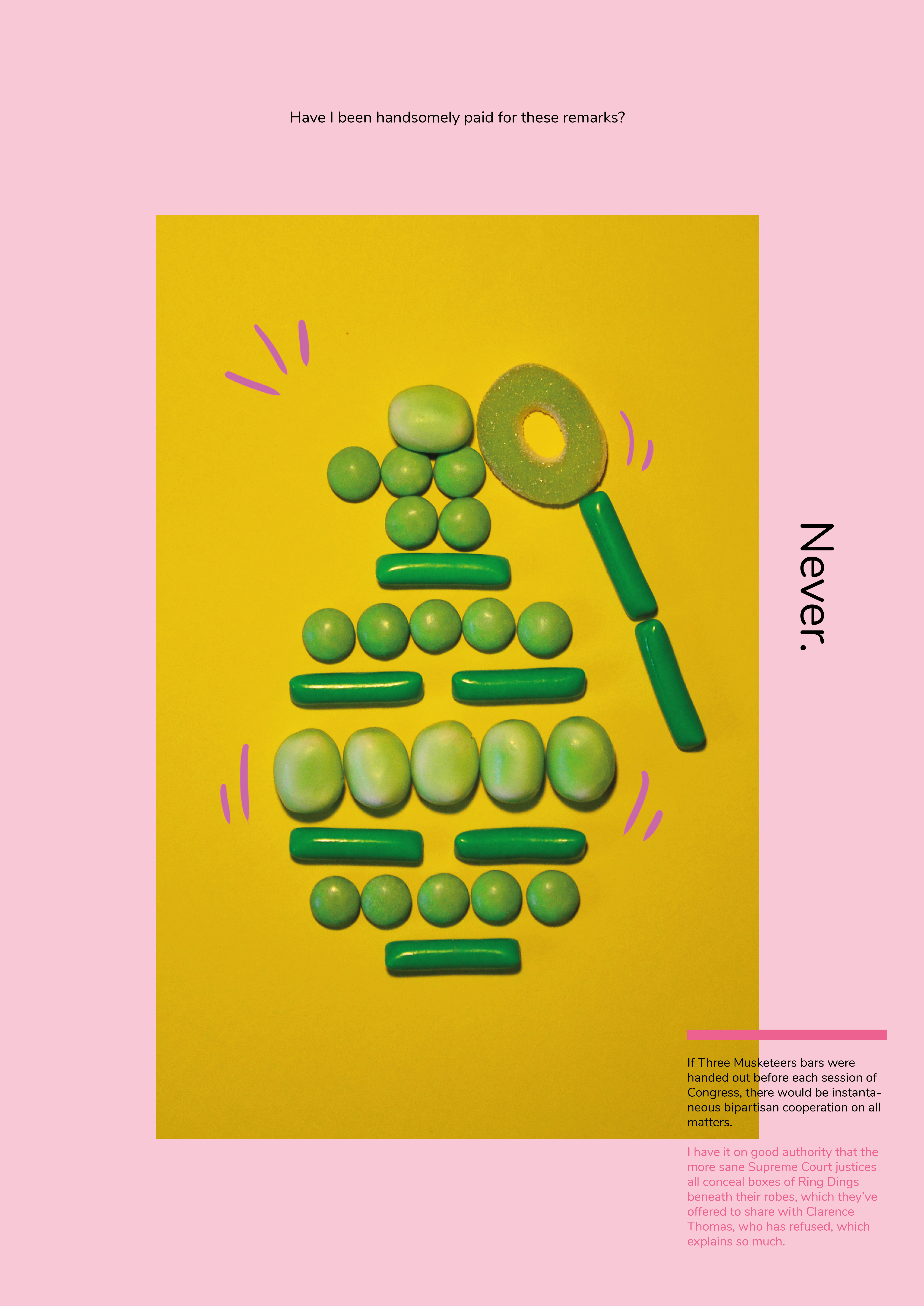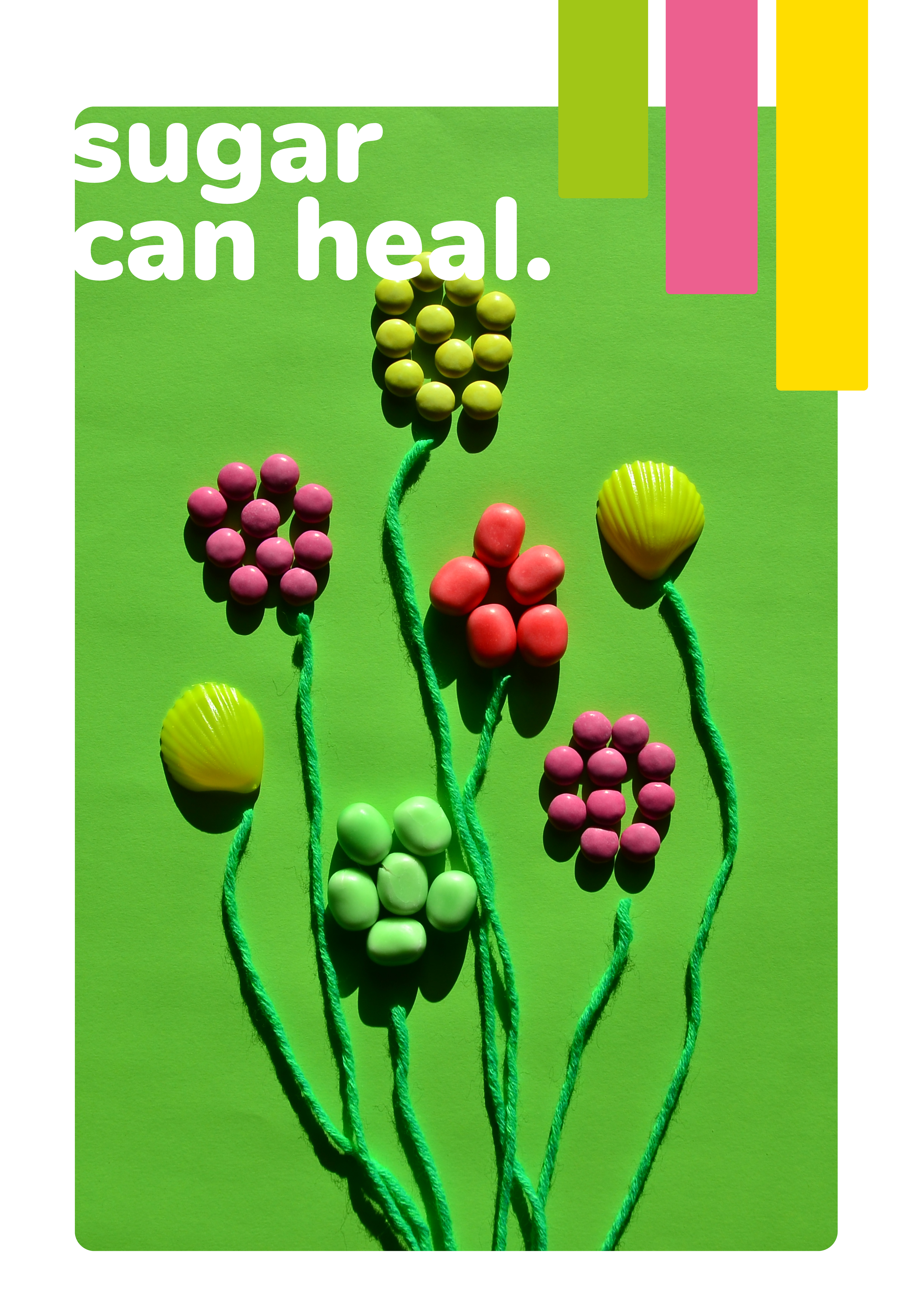 Die gewählten Farben waren hellgrün, pink und gelb. Zudem hatte wurde ein Text zum Thema Zuckerkonsum des Autors Paul Rudnick ausgesucht. Das Layout setzte sich aus drei Teilen zusammen: Zuerst wurde eine Art Mini-Lookbook gestaltet, dass des Prozess dokumentiert. Im zweiten Teil wurde die Fotoserie umfassend beleuchtet, und im dritten Teil habe wurde sich intensiv mit verschiedenen Layout-Möglichkeiten befasst. In diesem Zuge sind ein kleines Magazin, zwei Poster und eine Rubbellos-Seite entstanden.