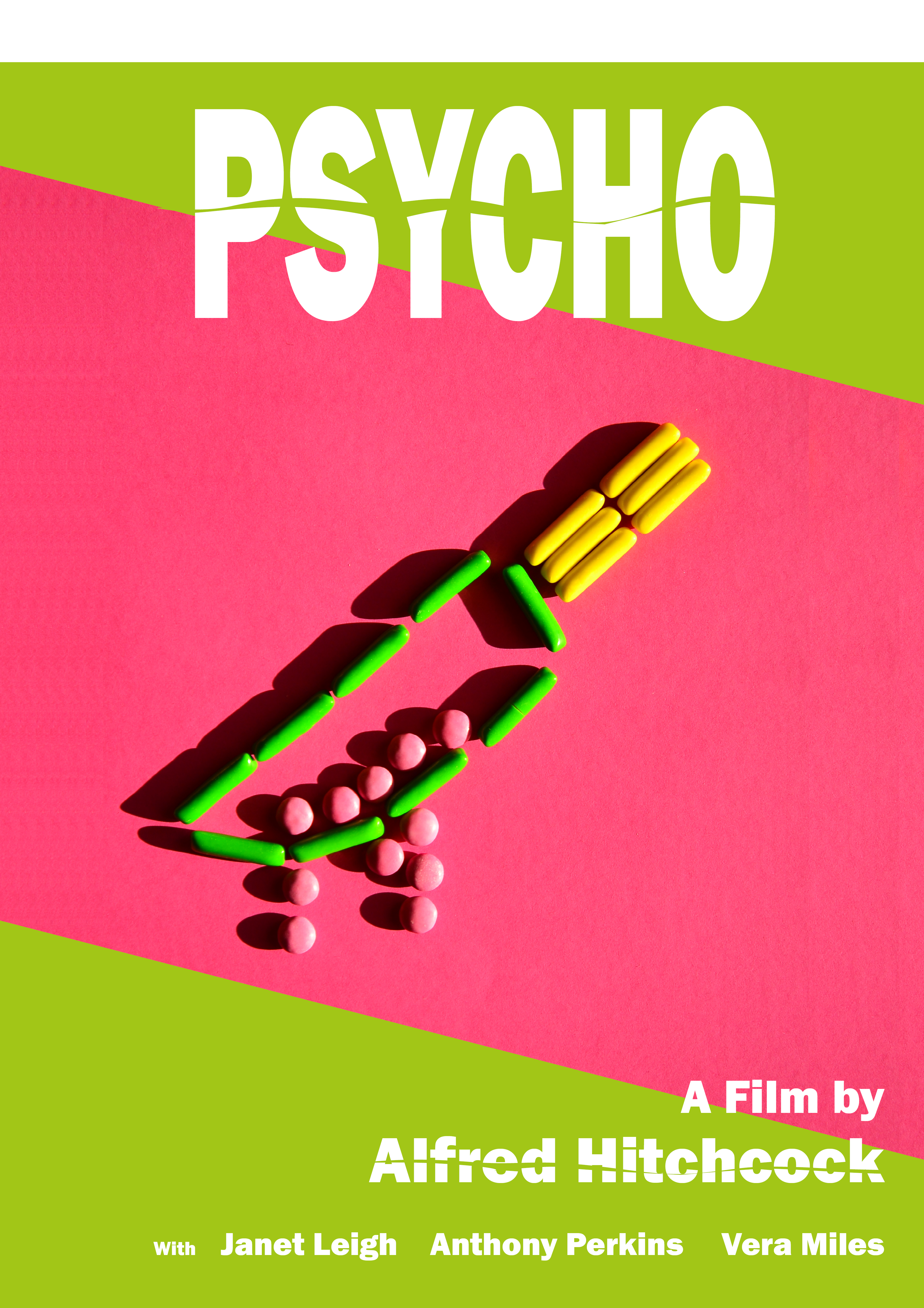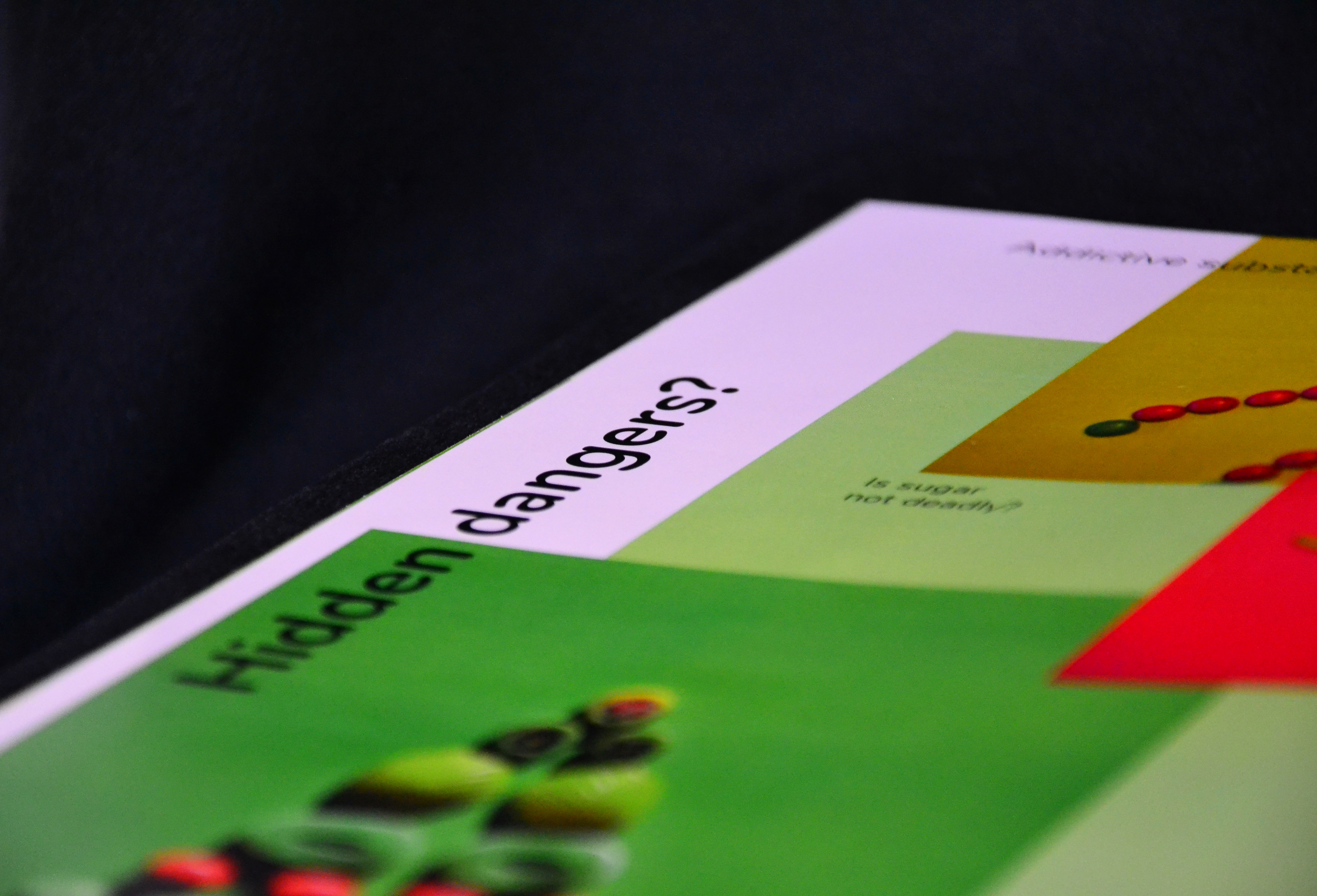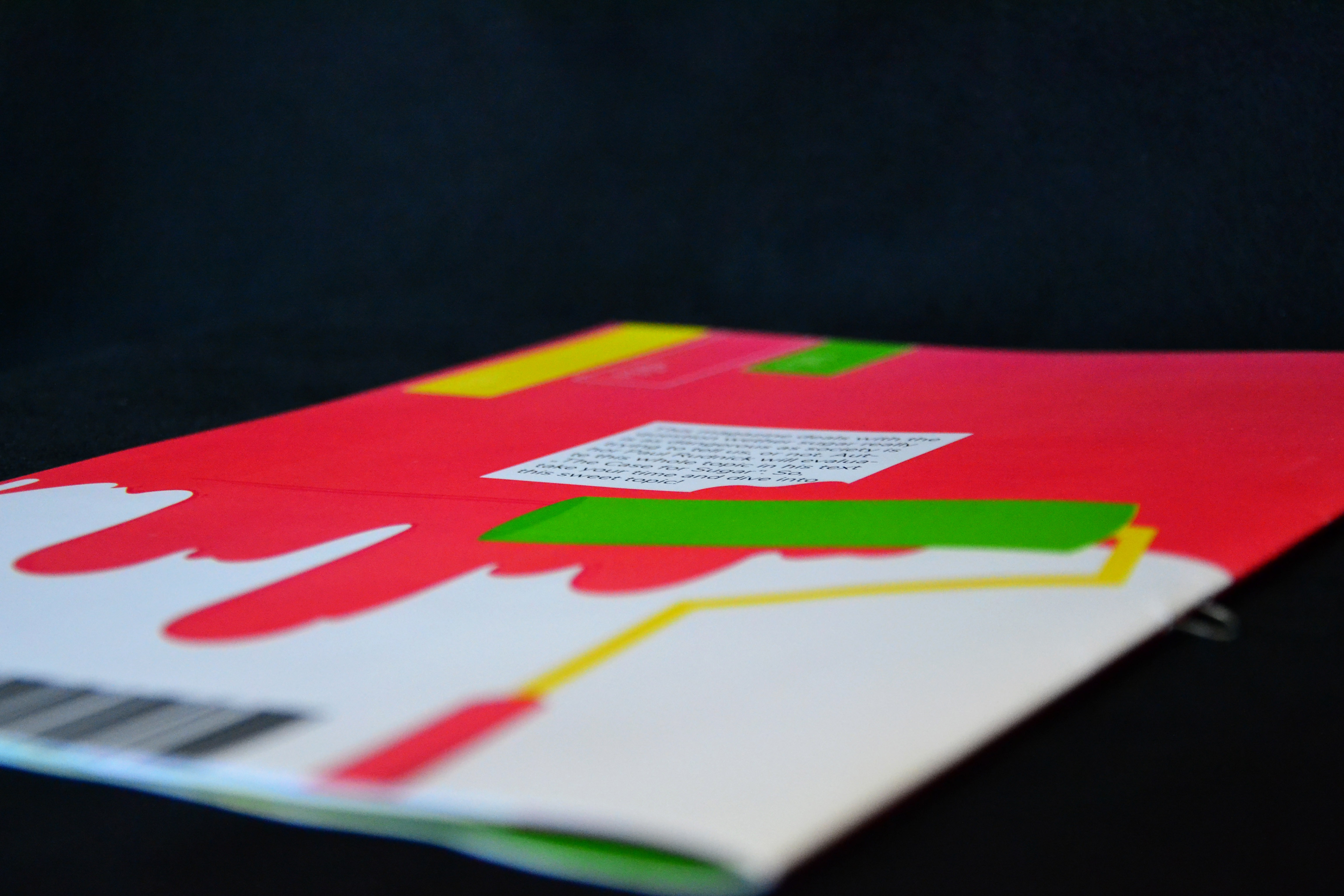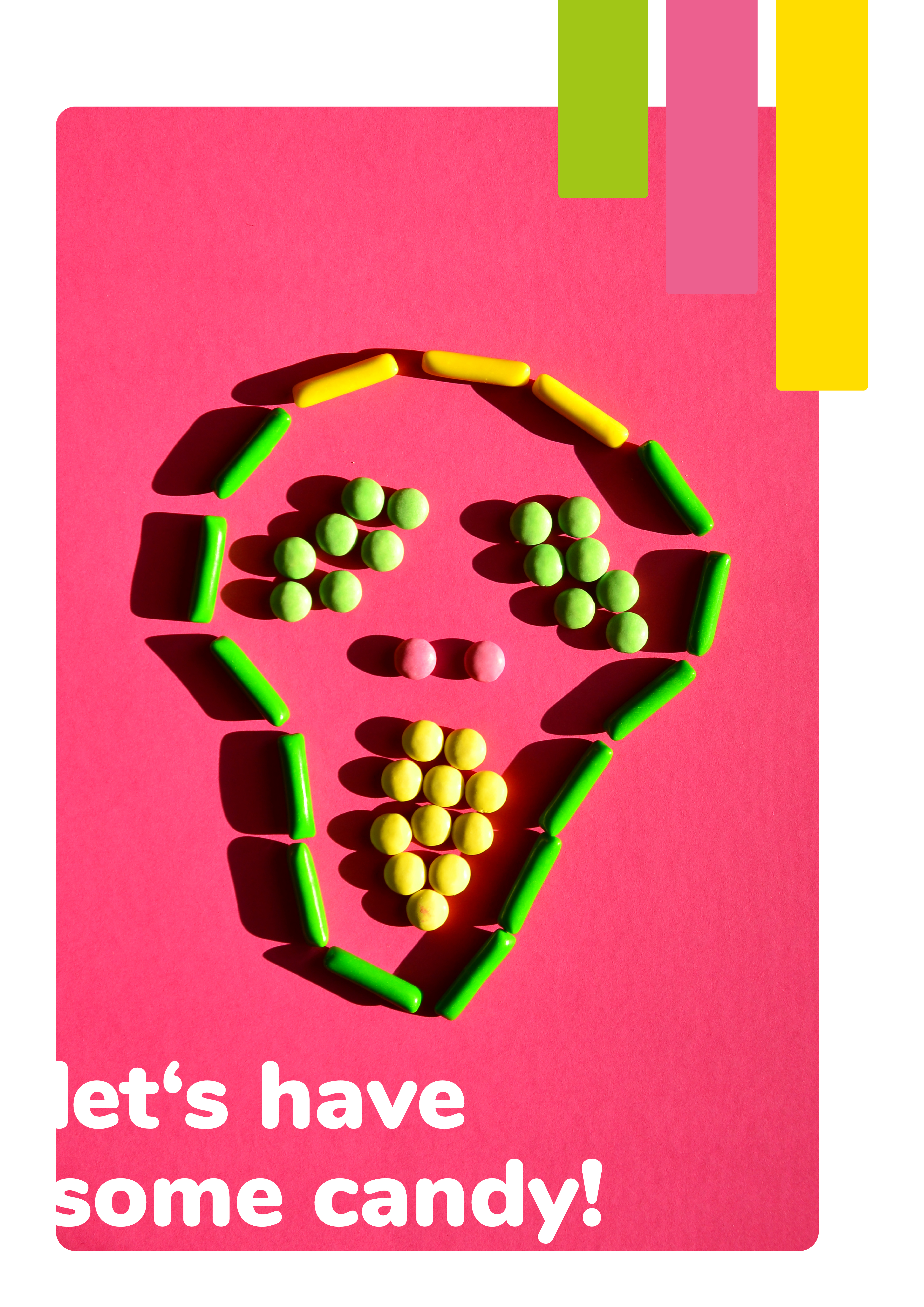Die gewählten Farben waren hellgrün, pink und gelb. Zudem hatte wurde ein Text zum Thema Zuckerkonsum des Autors Paul Rudnick ausgesucht. Das Layout setzte sich aus drei Teilen zusammen: Zuerst wurde eine Art Mini-Lookbook gestaltet, dass des Prozess dokumentiert. Im zweiten Teil wurde die Fotoserie umfassend beleuchtet, und im dritten Teil habe wurde sich intensiv mit verschiedenen Layout-Möglichkeiten befasst. In diesem Zuge sind ein kleines Magazin, zwei Poster und eine Rubbellos-Seite entstanden.