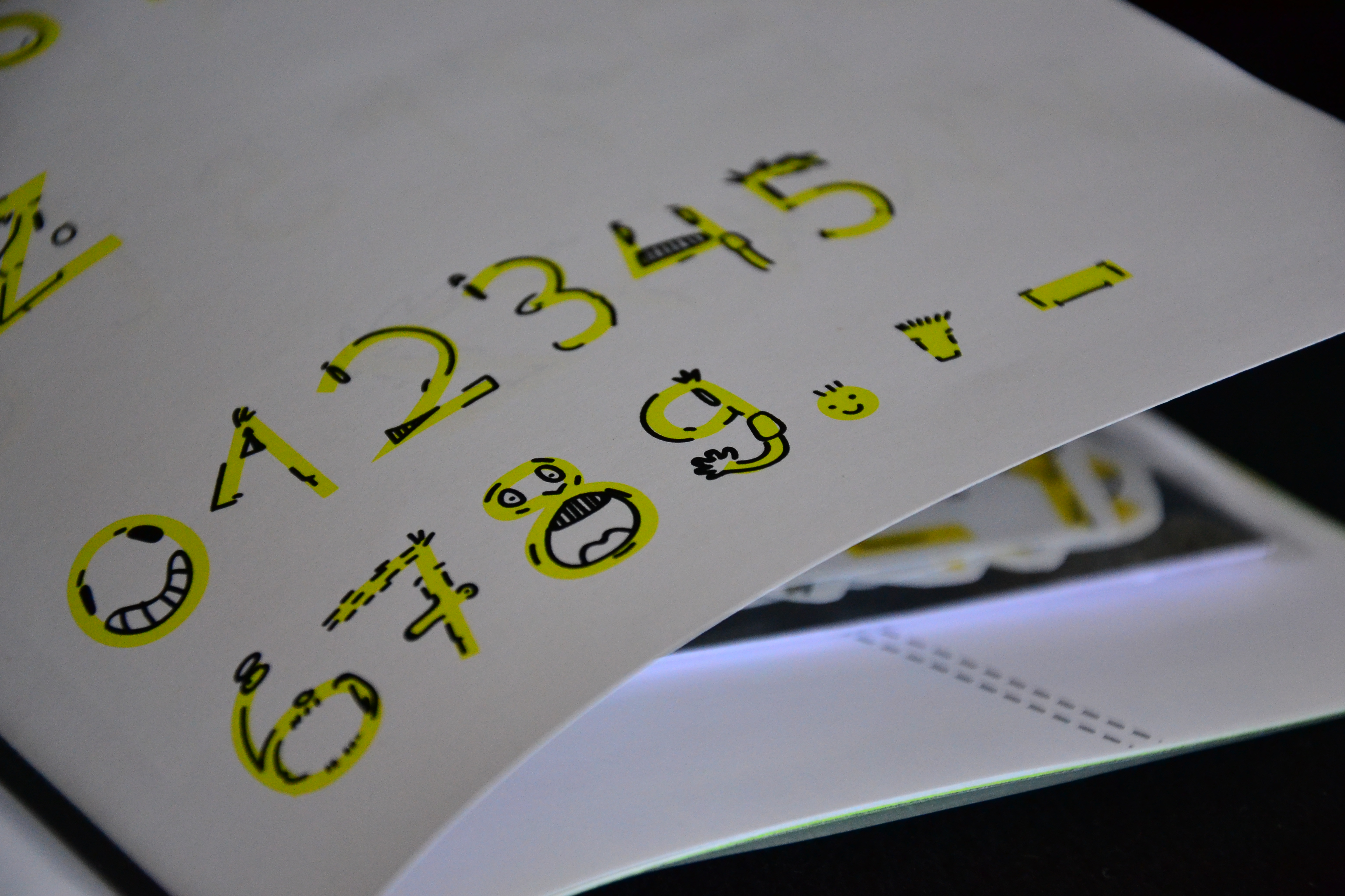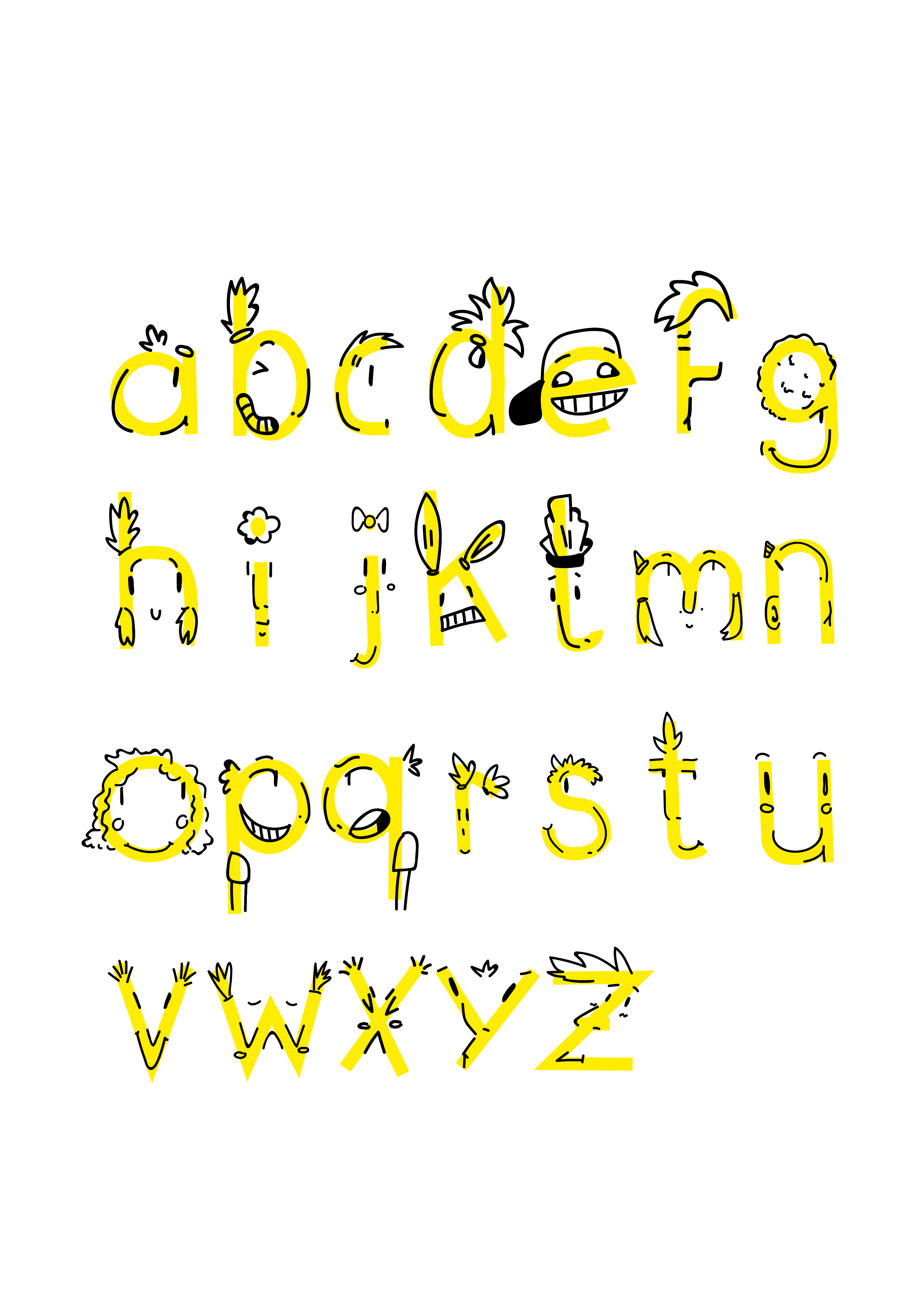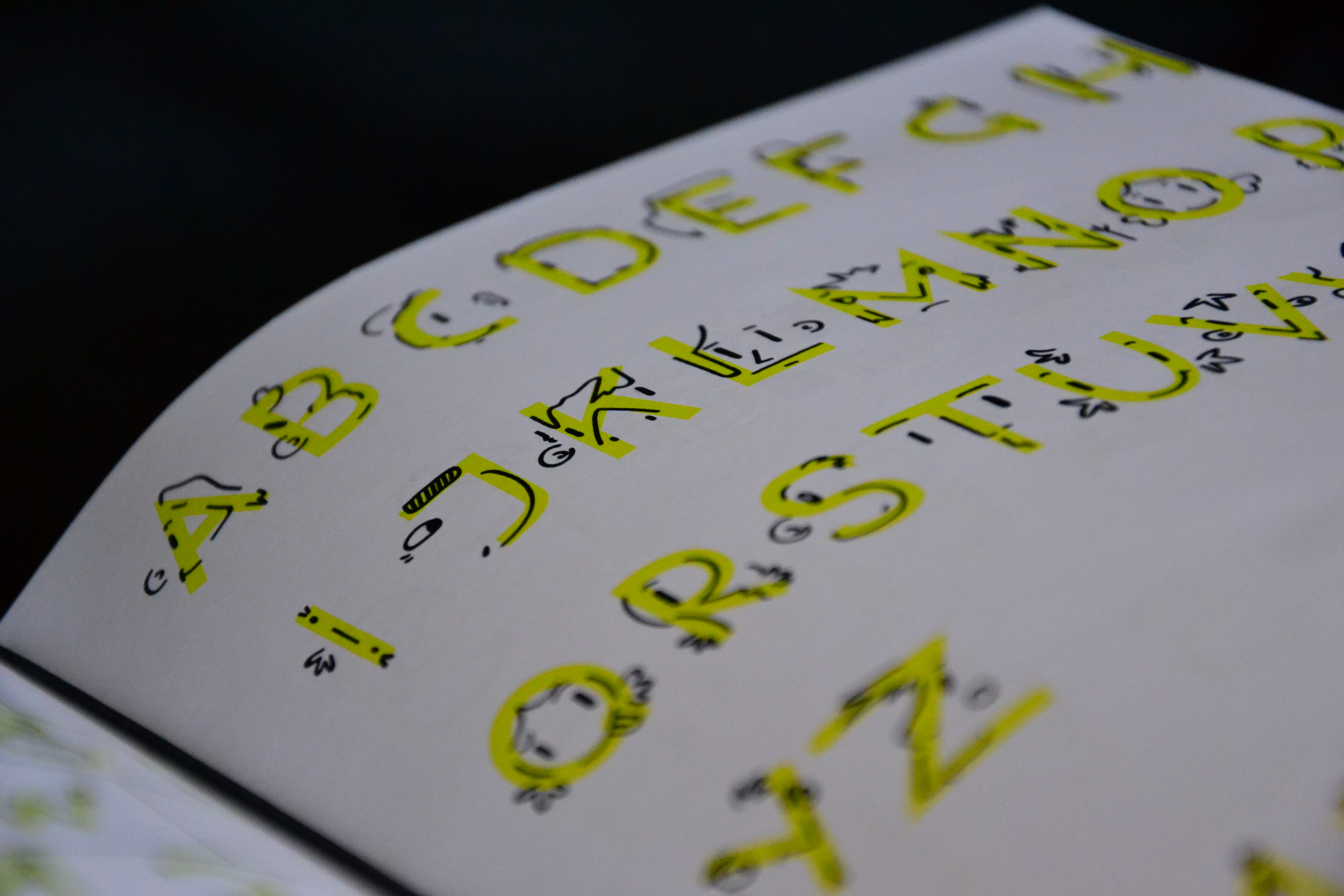 Zunächst wurden viele Entwürfe in einem Skizzenbuch erstellt, um im Anschluss die „Face-Font“ umzusetzen. Die Schrift besteht aus Gesichtern in den Formen der jeweiligen Buchstaben. Sie kann als Headline Schrift zum Beispiel für Plakate oder Kindermagazine verwendet werden. Als zweite Font wurde die „Gordo“ gestaltet. Diese besteht aus abgerundeten Rechtecken bzw. Quadraten und wirkt insgesamt sehr fett. Auch sie ist für Headlines gedacht.
