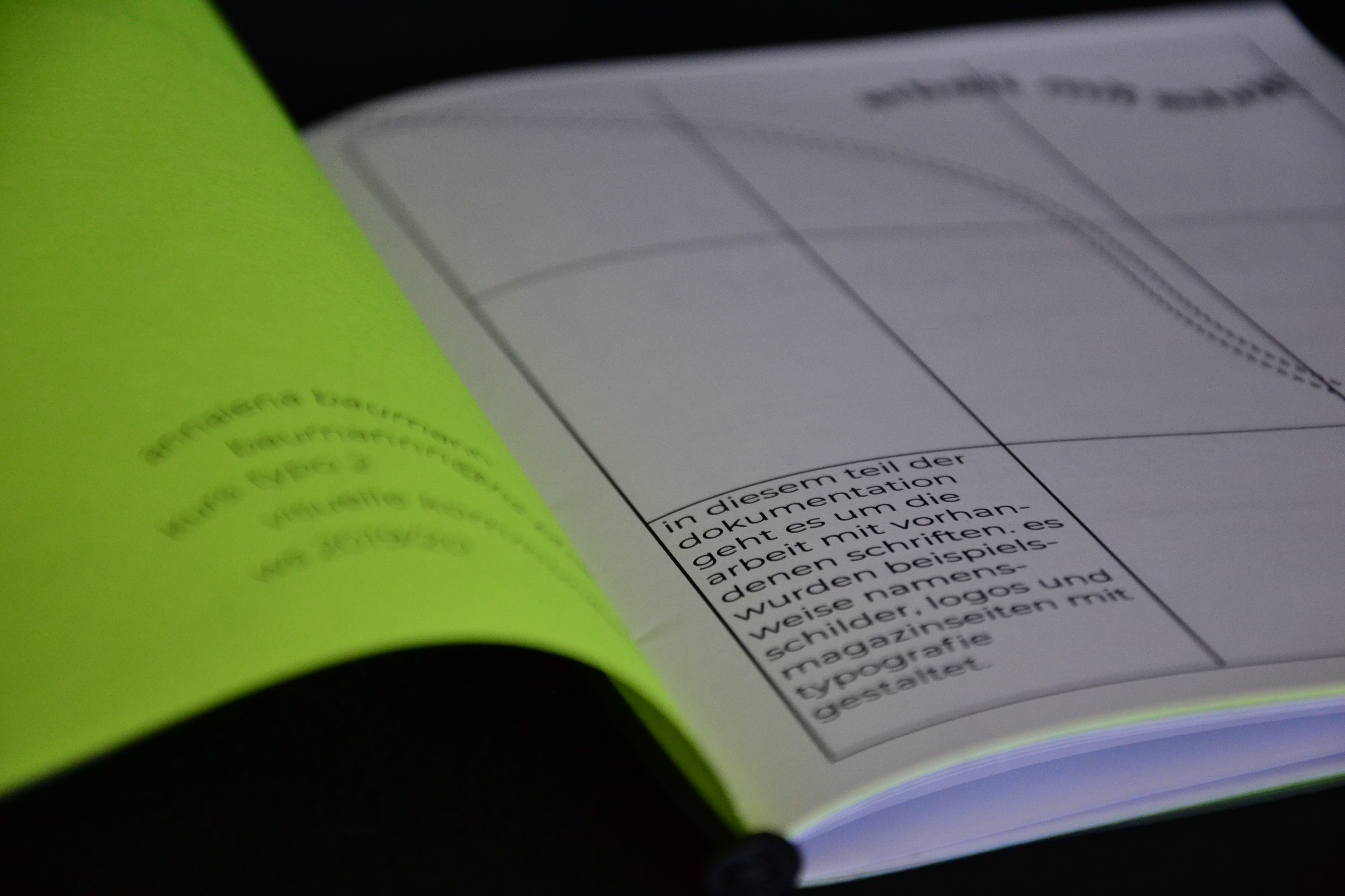 Ziel des Kurses war es, mit Typografie zu experimentieren und sowohl die Arbeit mit vorhanden Schriften zu üben, als auch selbst eine Schrift zu erstellen und diese auch zu digitalisieren. Am Ende des Kurses wurde das Semester in eine Print-Projektdokumentation im Format DinA5 festgehalten.